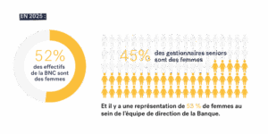 Au cours de la dernière décennie, la BNC a connu une évolution majeure de ses métiers, marquée, entre autres, par une transition vers des secteurs plus technologiques, traditionnellement plus masculins. Ce changement a permis à la Banque d’évoluer vers une situation de parité à l’échelle globale de l’organisation, tout en conservant la proportion de femmes aux postes de gestion senior et exécutif. Un résultat qui témoigne de l’efficacité des efforts déployés pour soutenir l’ambition des femmes. Au niveau même de l’équipe de direction, et depuis 2024, la parité est également atteinte.
