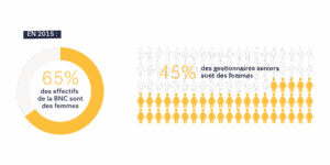 En 2015, les femmes représentent 65 % des effectifs de la BNC. Elles sont au cœur des objectifs d’affaires et du service à la clientèle de l’institution. Toutefois, seulement 45 % des gestionnaires seniors sont des femmes.